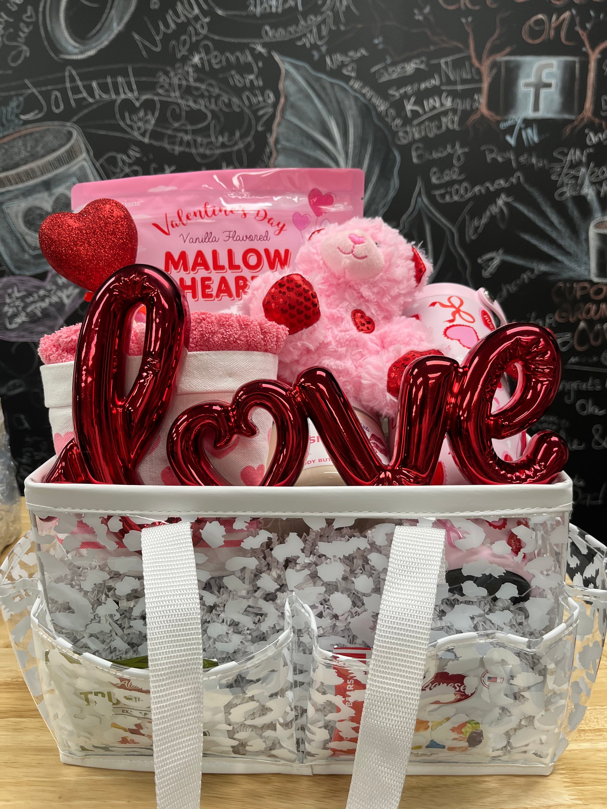 Celebrate love with this exclusive Valentine's Day gift set, curated for romance and indulgence. This limited-edition collection arrives beautifully packaged in an extra-large white vinyl bag adorned with shimmer LOVE decor and two red shimmer hearts on a stick. Inside, discover a luxurious 16oz SMOOCHES body cream, a plush mini pink teddy bear, oversized marshmallow heart candies, a stunning metal hearts and ribbons tumbler, and a coordinating pink and white towel bundle. Every element is designed to delight and comfort your special someone. With only one available, this one-of-a-kind set makes an unforgettable gift that combines thoughtful touches with premium quality. Wrapped and ready to impress.