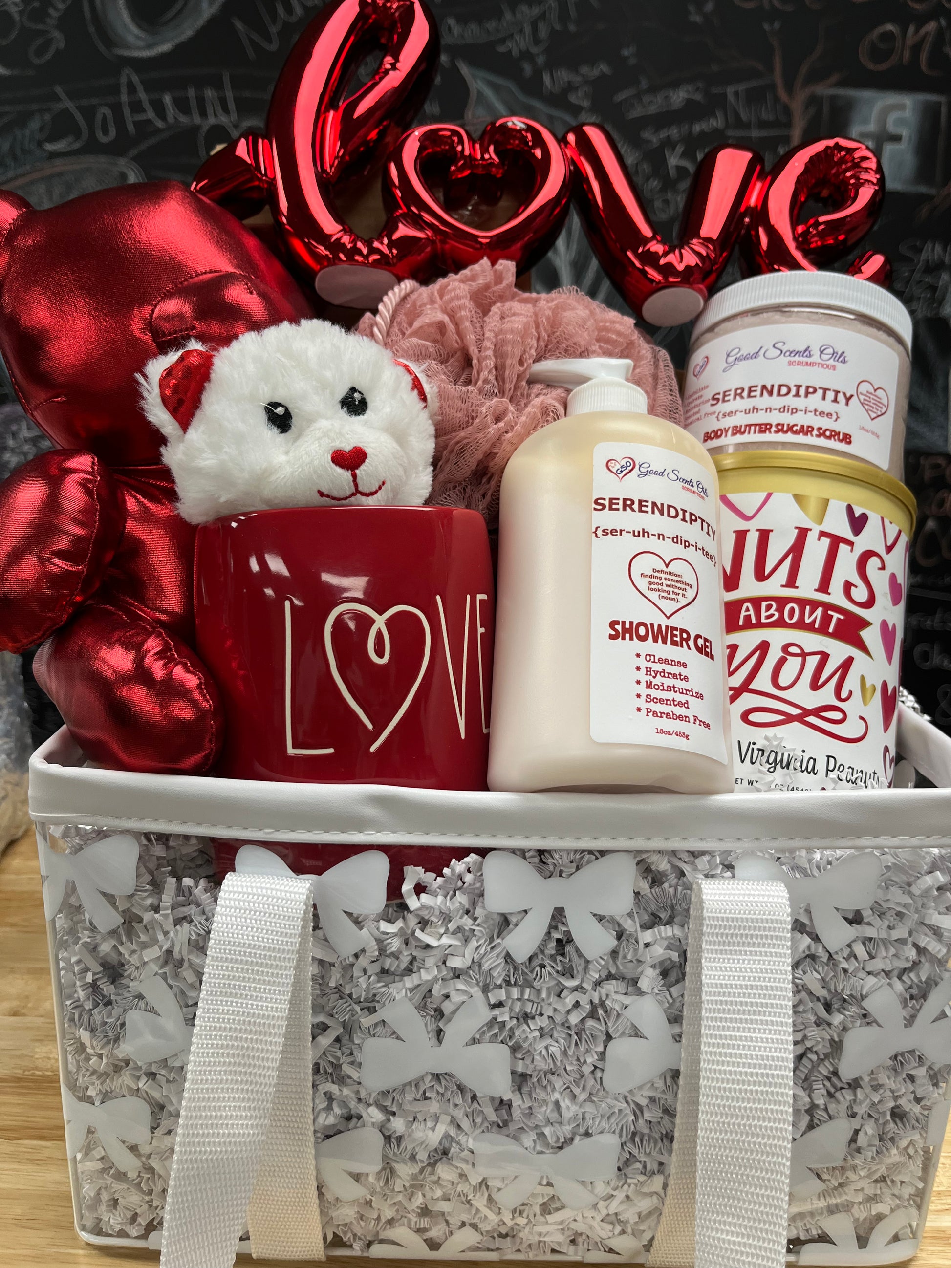 Celebrate love with the Nuts About You Valentine's Day Gift Set—a thoughtfully curated collection perfect for that special someone. This exclusive set arrives beautifully packaged and includes a stylish white vinyl reusable bag with handles, a charming Love Mug, plush satin red teddy bear, and shimmering red love décor to set the mood. Pamper your loved one with luxurious Serendipity body scrub and shower gel (16oz each), a soft mauve mesh sponge, and gourmet salted peanuts for a touch of indulgence. Limited to just one available—make this Valentine's Day unforgettable with a gift that combines romance, relaxation, and everyday elegance.